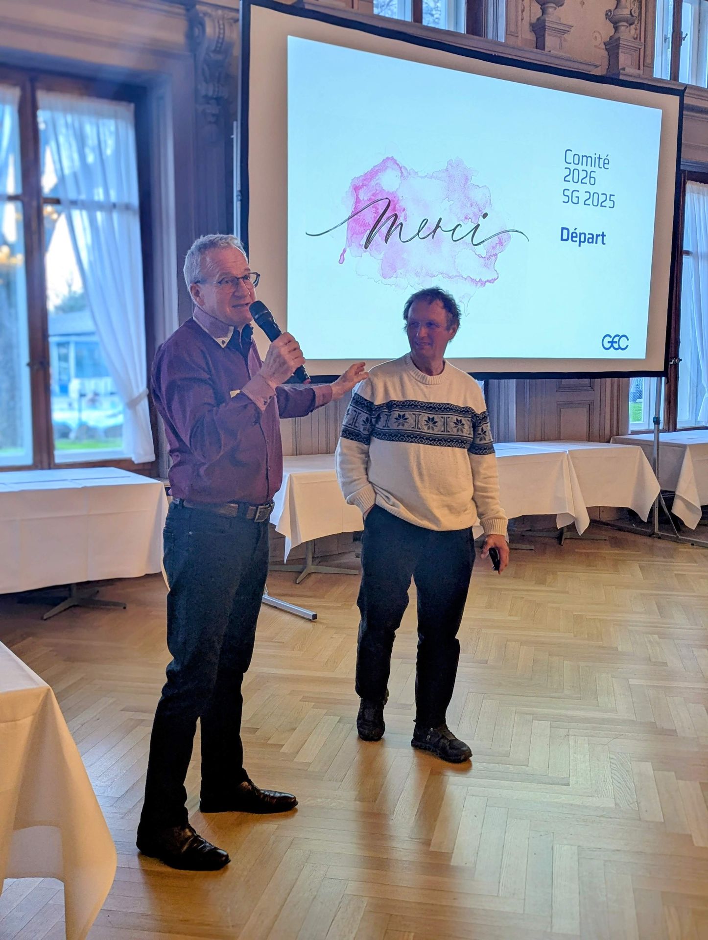 Cette soirée a notamment été marquée par un moment important pour notre association : nous avons pris congé de deux membres engagés de longue date au sein de notre comité, Bruno Peterer, co-président, ainsi que Christophe Ruppen. Tous deux ont consacré de nombreuses années au service du GEC et des entreprises de notre belle région. Par leur engagement, leur disponibilité et leur attachement au tissu économique chablaisien, ils ont contribué de manière précieuse à la vie et au développement de notre association. Nous leur adressons encore une fois nos plus sincères remerciements.